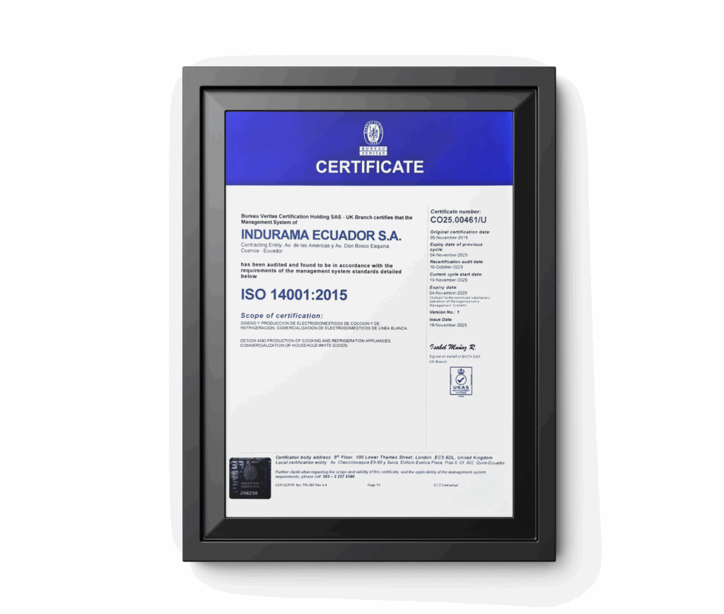 La empresa francesa Bureau Veritas, líder mundial en servicios de Pruebas, Inspección y Certificación (TIC), ha otorgado a Indurama la certificación ISO 14001, con una vigencia de tres años, que avala el cumplimiento del estándar internacional para los Sistemas de Gestión Ambiental (SGA).